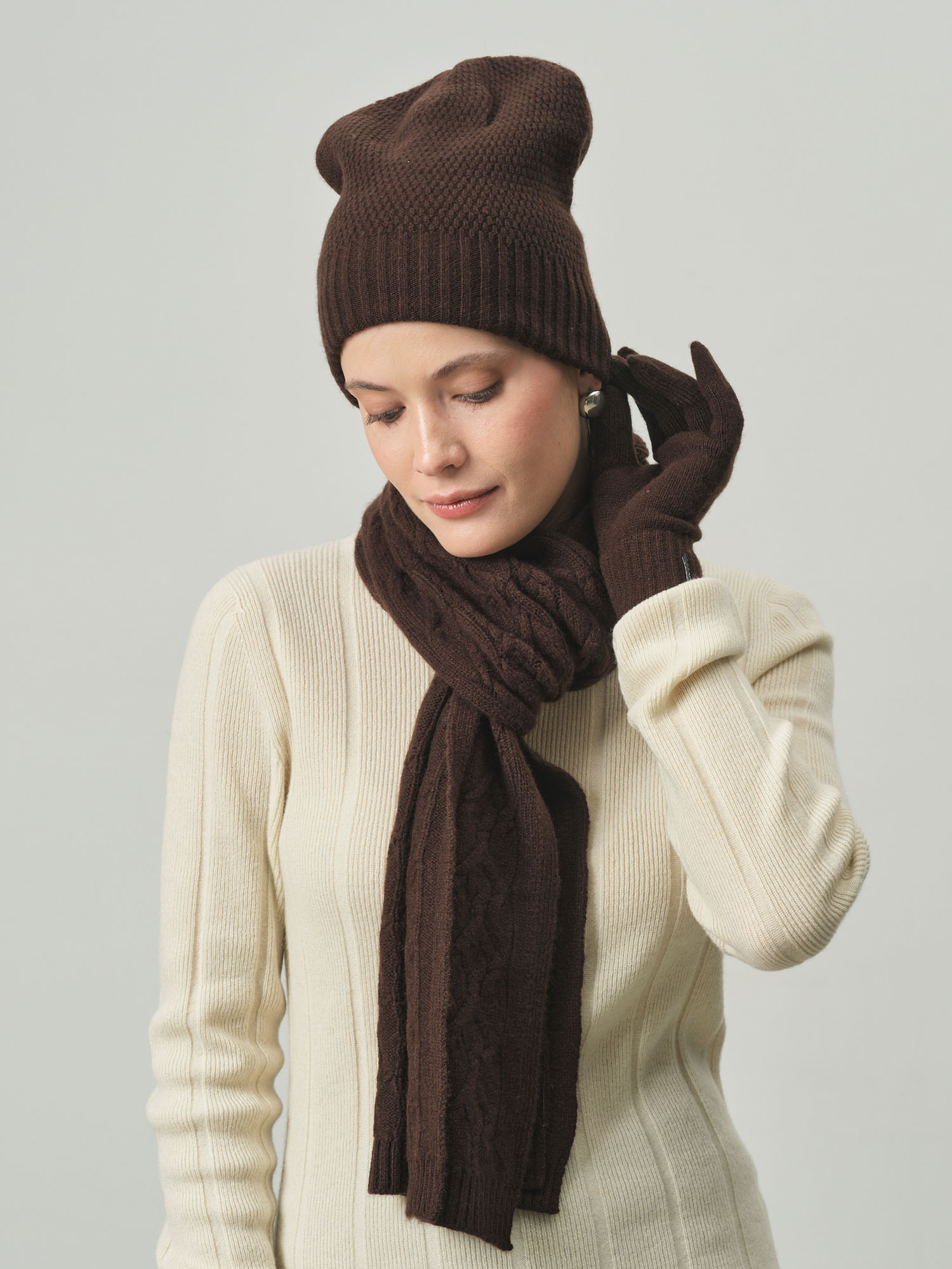 Кашемировая шапка с выразительной вязкой — стильный аксессуар, который сочетает тепло, комфорт и акцентный внешний вид. Идеально дополняет зимние образы, добавляя им глубину и текстуру.