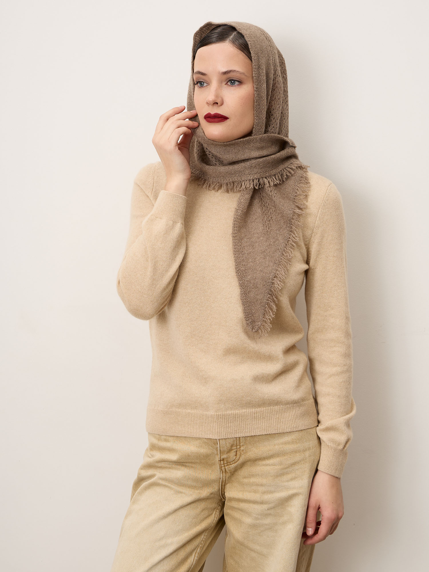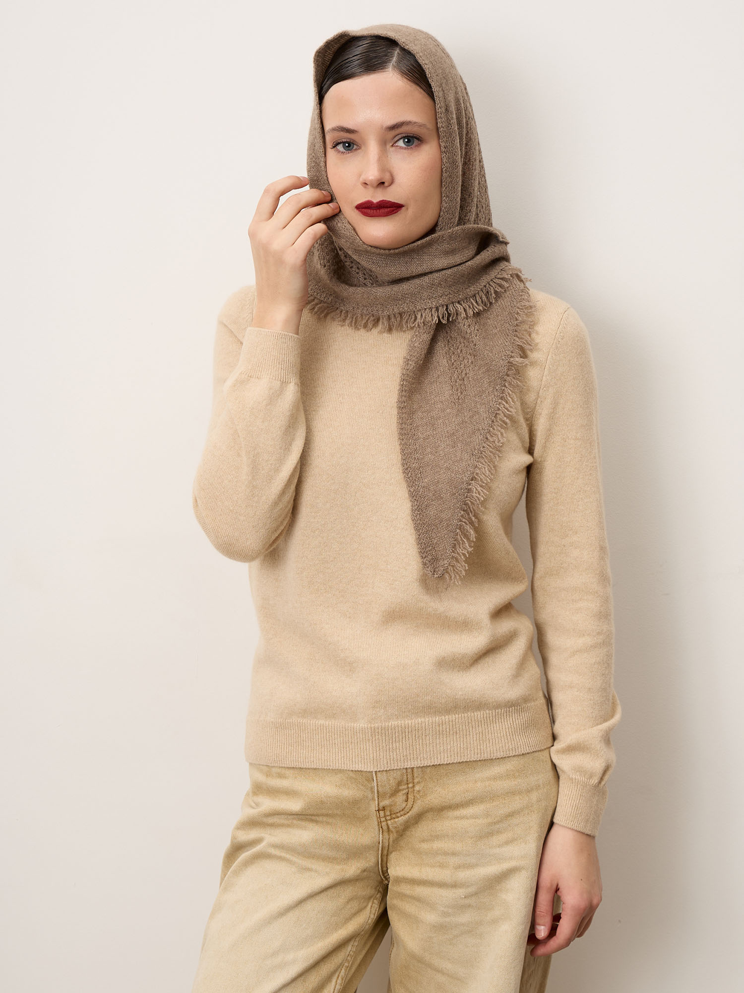 Косынка из кашемира 16-24-215-0C в оттенке капучино — элегантный и универсальный аксессуар для холодного сезона. Модель сочетает в себе классическую форму и мягкую струящуюся фактуру, создавая утончённый и женственный образ. Косынка красиво драпируется вокруг шеи или головы, добавляя образу лёгкость и благородную завершённость.
