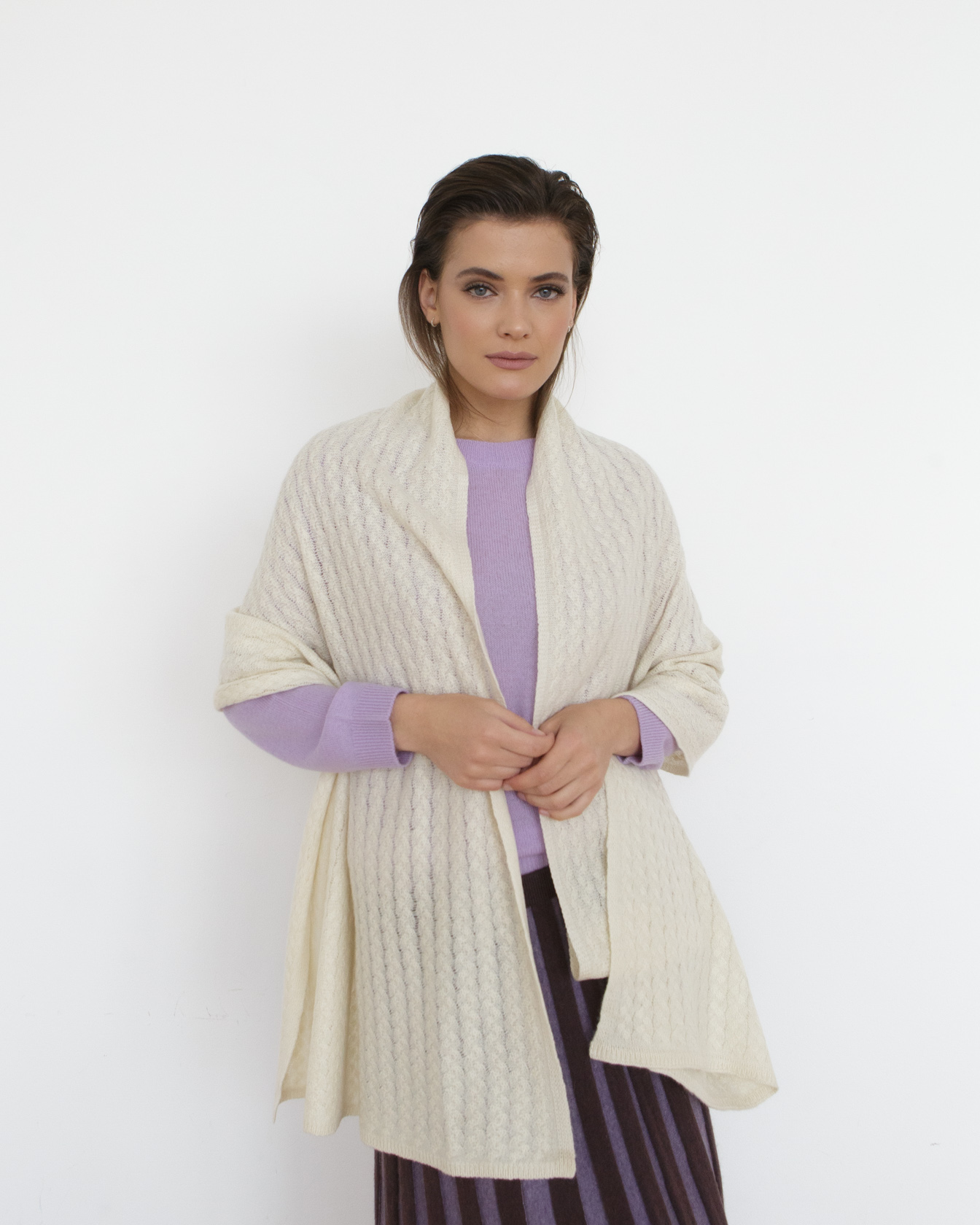 Дизайн и детали: Прямоугольная форма с аккуратной фактурной вязкой и мягкими складками. Минималистичный дизайн делает изделие универсальным и подчеркивает благородство материала.