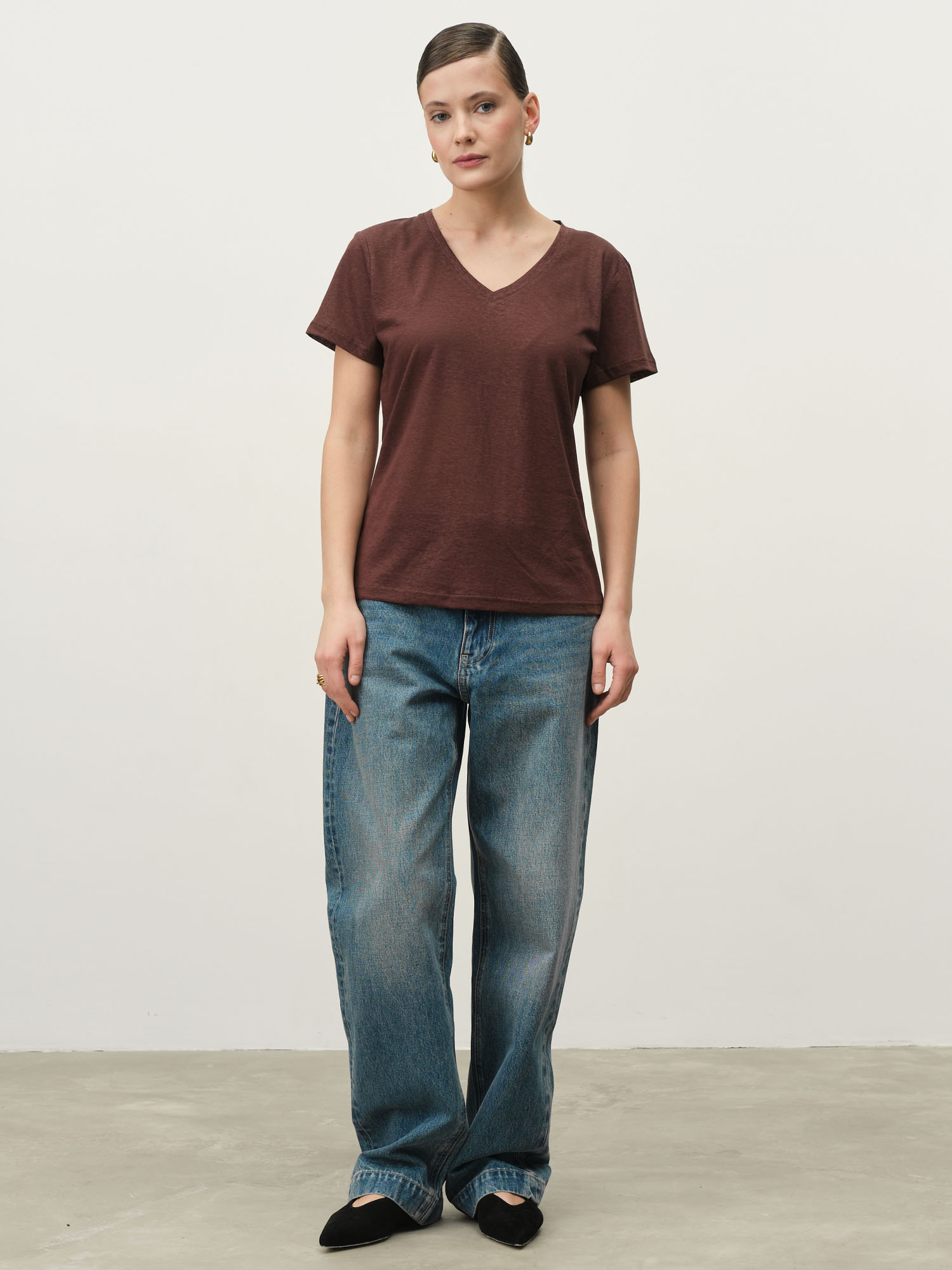 Футболка из крапивы в насыщенном шоколадном оттенке — стильное и экологичное решение. Натуральный материал дарит комфорт и хорошую воздухопроницаемость. V-образный вырез подчеркивает линию шеи и добавляет элегантности. Идеальна для повседневного гардероба.