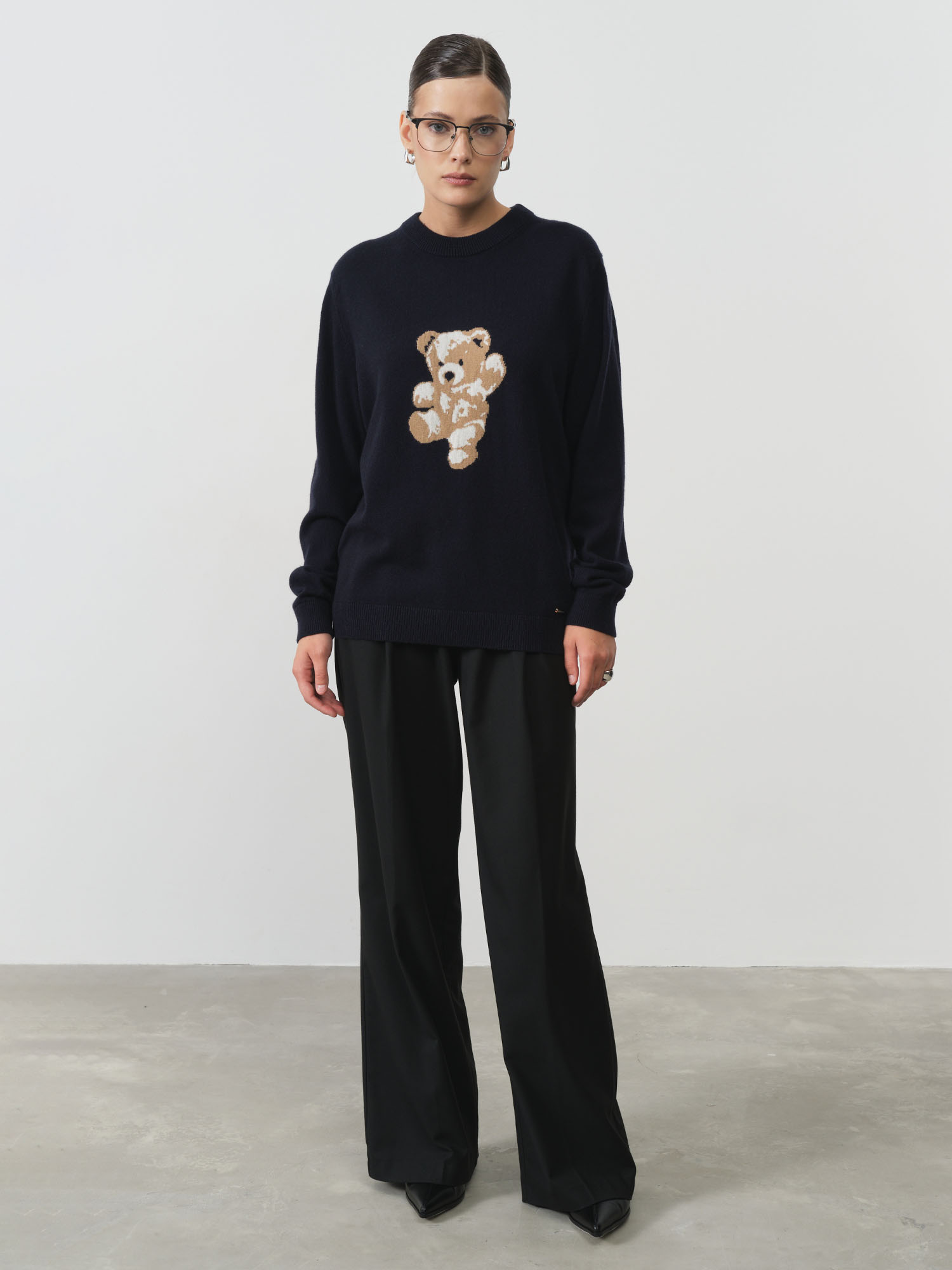 Модель выполнена в прямом силуэте с классическим круглым вырезом и гладкой вязкой. Центральным элементом дизайна является декоративная аппликация медвежонка, которая добавляет изделию индивидуальности и современного настроения.