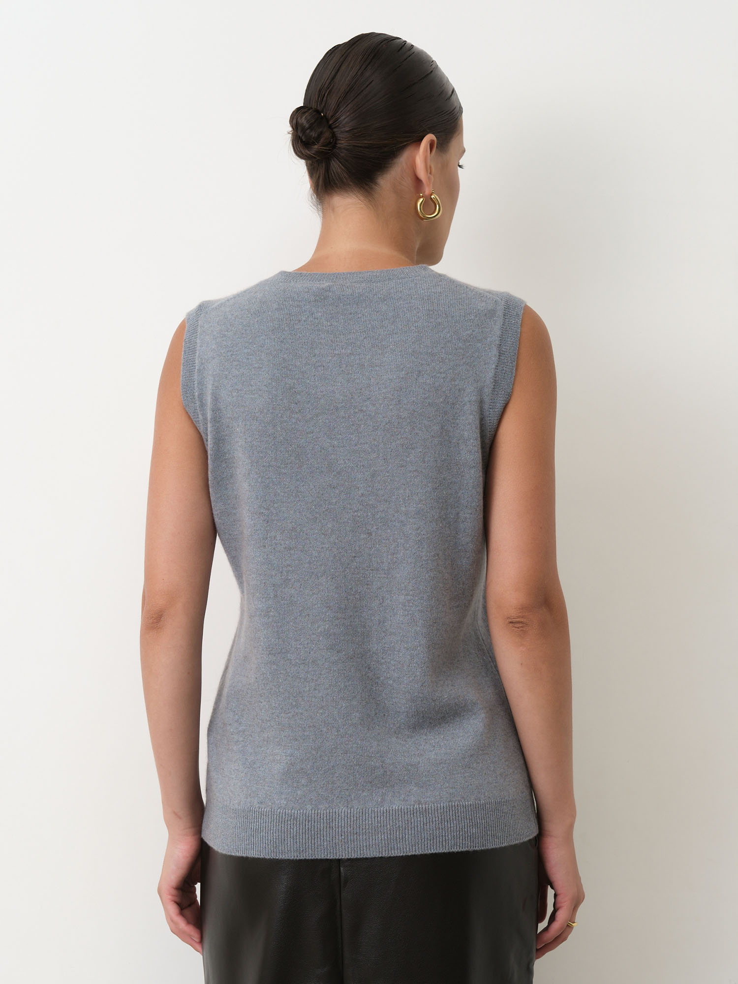 Модель выполнена без рукавов с аккуратной круглой горловиной и гладкой вязкой. Минималистичный крой подчёркивает благородную текстуру кашемира и создаёт современный универсальный силуэт. Нижний край изделия оформлен эластичной вязкой, что помогает сохранять форму.