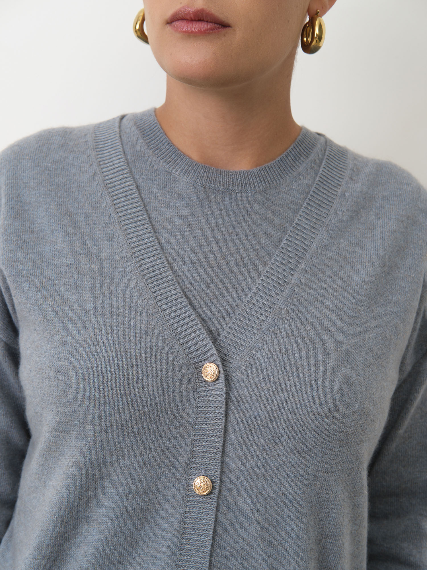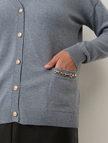 Застёжка на пуговицы, декоративные карманы с отделкой и изящными элементами, аккуратная трикотажная отделка манжет и нижнего края. Ровная вязка сохраняет форму изделия и подчёркивает качество материала.